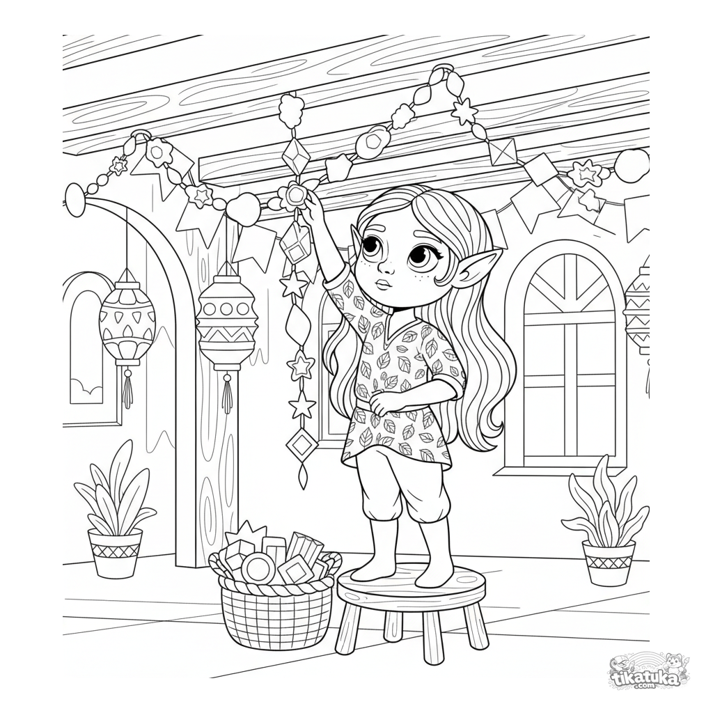 Раскраска для детей: эльфийка украшает праздничный зал гирляндой. Сцена с деталями для возраста 7-9 лет, полная фигура, широкие поля для раскрашивания.
