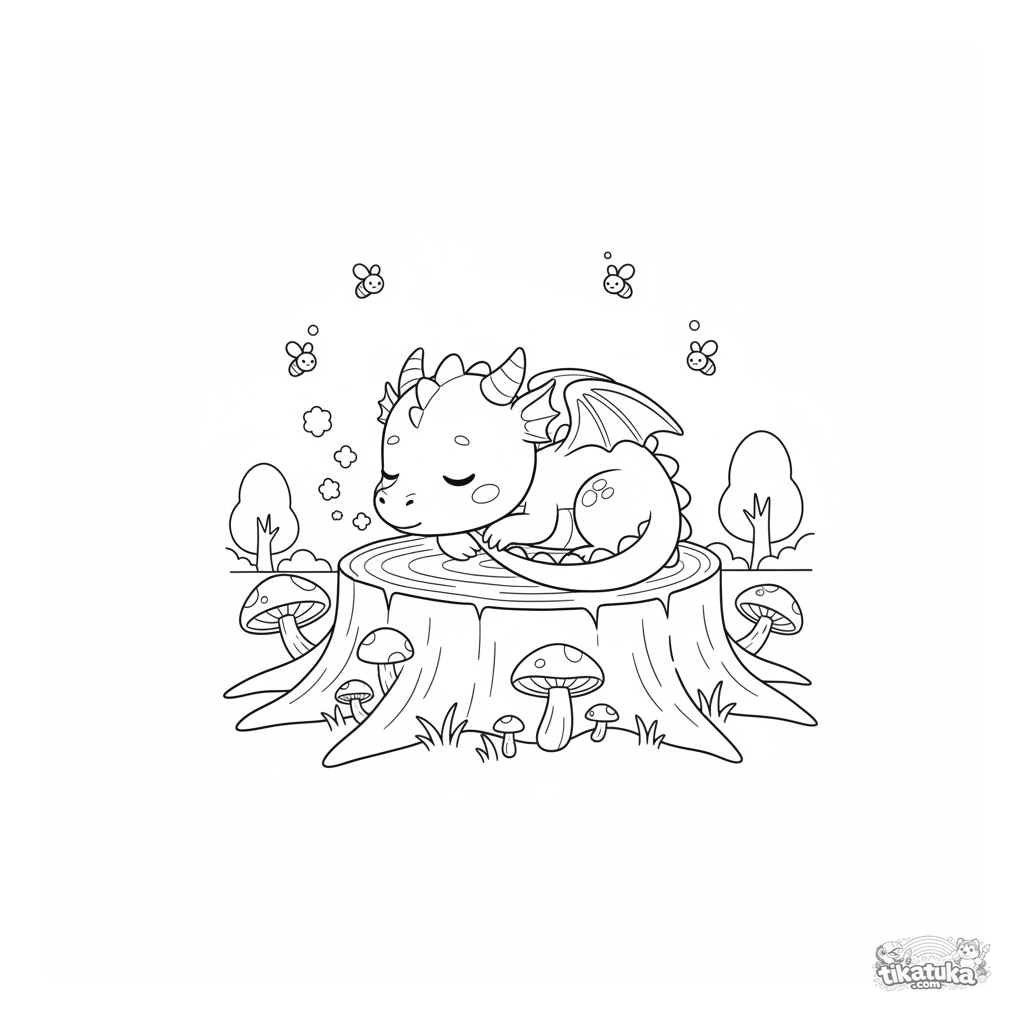 Простая раскраска для малышей 2-3 лет: милый лесной дракончик спит на пеньке, покрытом грибами. Крупные формы, толстые контуры, почти нет фона.