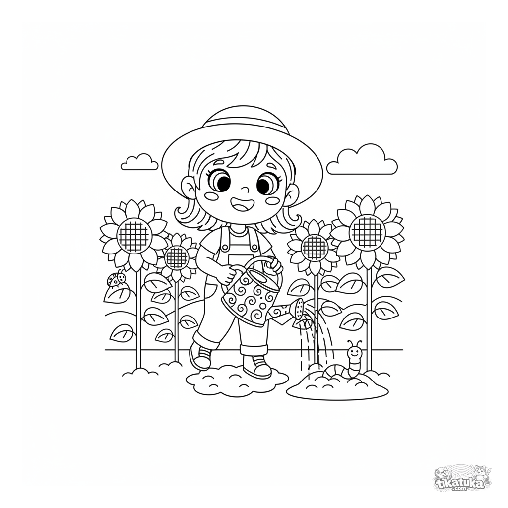 Раскраска: девочка-садовник в шляпе поливает высокие подсолнухи из лейки. Для детей 5-8 лет. Детали: божья коровка, червячок, милая сцена в саду.