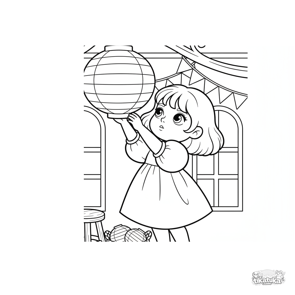 Раскраска для детей 4-6 лет: девочка украшает праздничный зал большими бумажными фонариками. Милая сцена подготовки к торжеству.