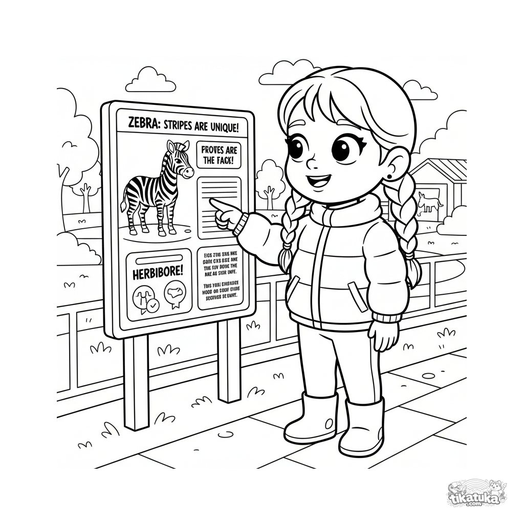 Раскраска для детей 4-6 лет: девочка изучает информационную табличку про зебру в зоопарке. Простая сцена для обучения и раскрашивания.