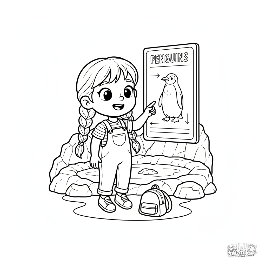 Раскраска для детей 4-6 лет: девочка читает информационную табличку о пингвинах в зоопарке. Учимся читать и узнаем о животных.