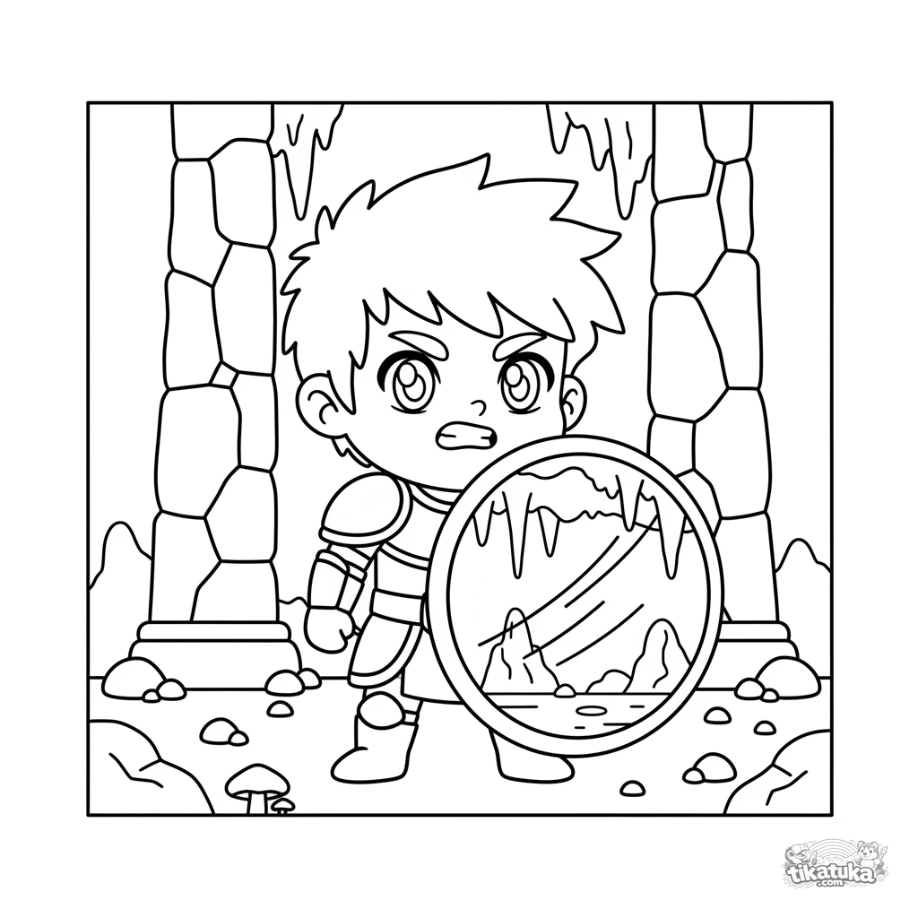 Раскраска для детей 4-6 лет: юный герой с зеркальным щитом в опасном логове Медузы Горгоны. Динамичная поза в стиле комикса, понятные контуры.