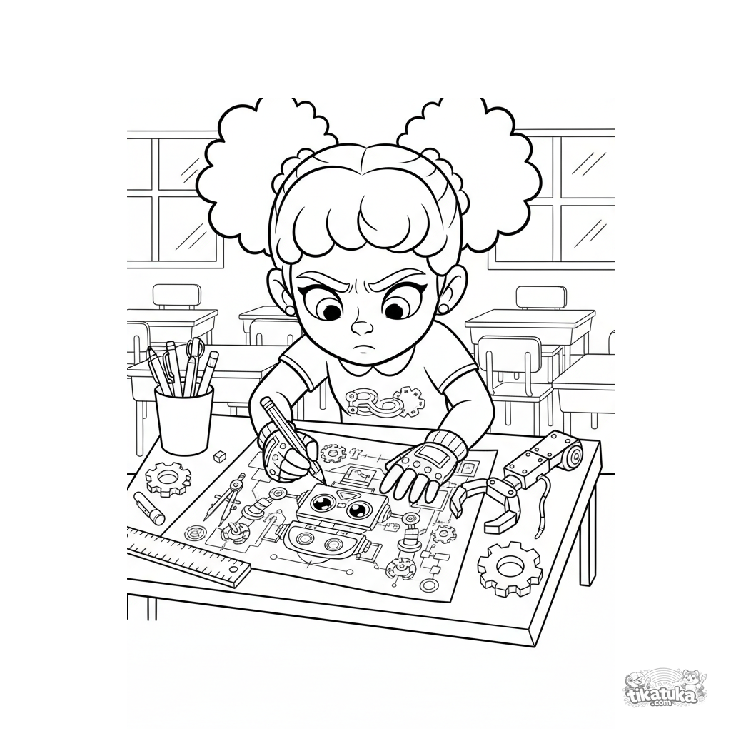 Раскраска для детей 10-12 лет: юный изобретатель в классе создает чертеж робота. Детализированная сцена с инструментами, шестеренками и прототипом.