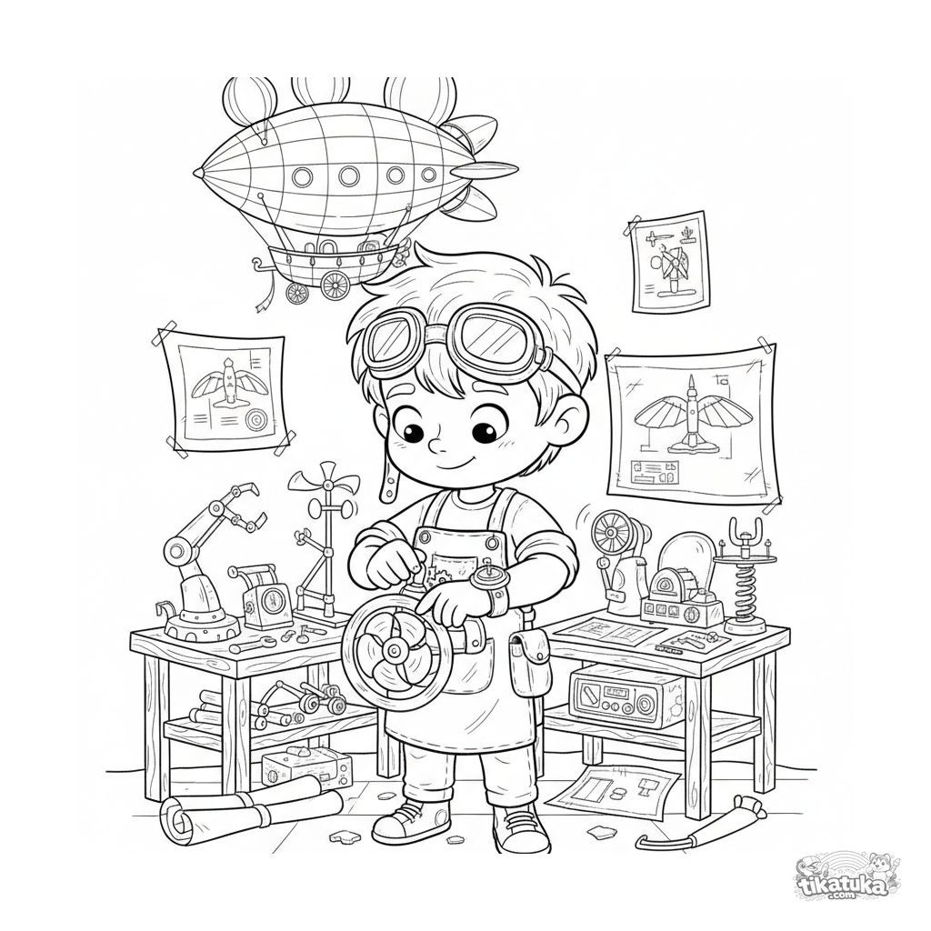 Раскраска для детей 7-9 лет: юный изобретатель в секретной лаборатории настраивает свои летающие очки среди чертежей и моделей дирижаблей.