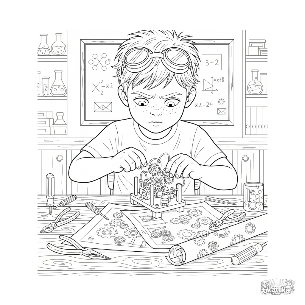 Раскраска для детей 10-12 лет: юный изобретатель за работой над механическим устройством в школьном классе. Детализированная научно-техническая сцена.