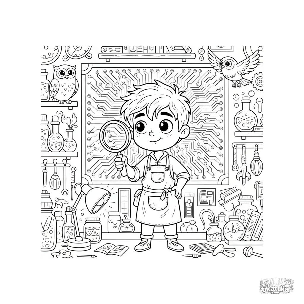 Раскраска для детей 7-9 лет: юный изобретатель изучает сияющий чертеж в секретной лаборатории, полной странных устройств и банок.