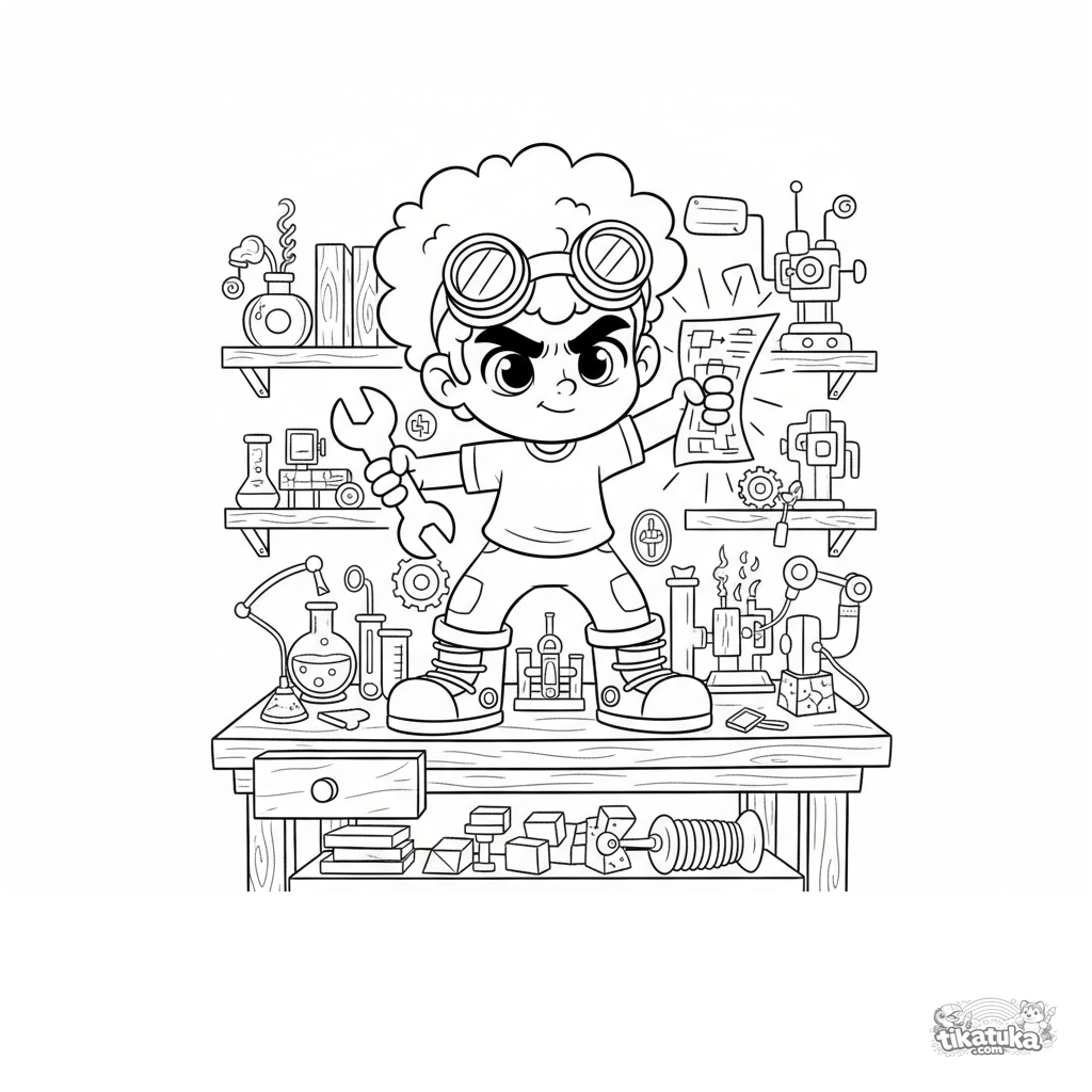 Раскраска для детей 7-9 лет: юный изобретатель в секретной лаборатории тестирует свои пружинные ботинки среди гаджетов и чертежей.