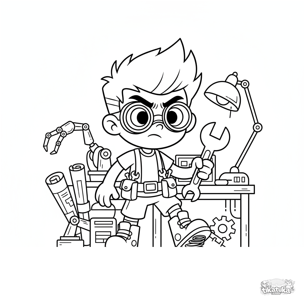 Раскраска для мальчиков 7-9 лет: юный изобретатель тестирует пружинные ботинки в секретной лаборатории, полной чертежей и механизмов.