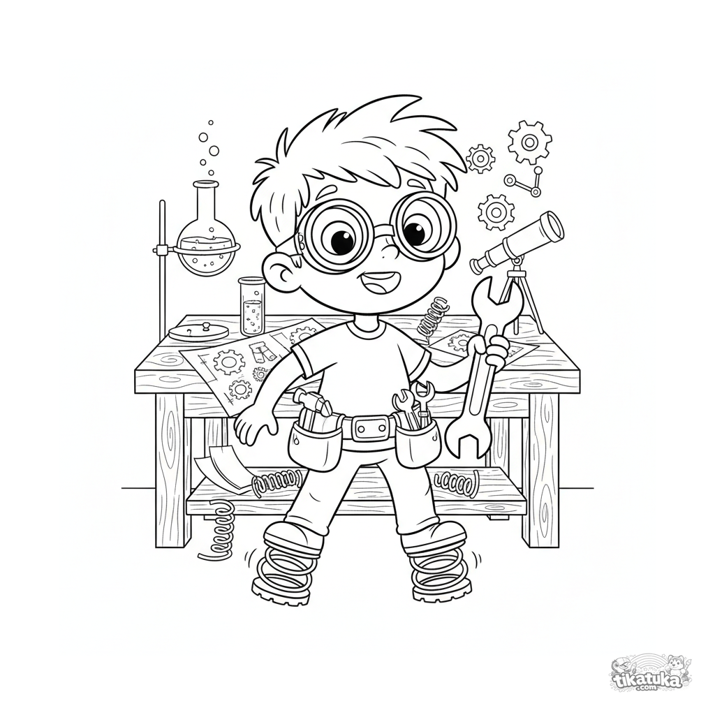 Раскраска для детей 4-6 лет: юный изобретатель в секретной лаборатории тестирует пружинные ботинки. На столе чертежи и инструменты.