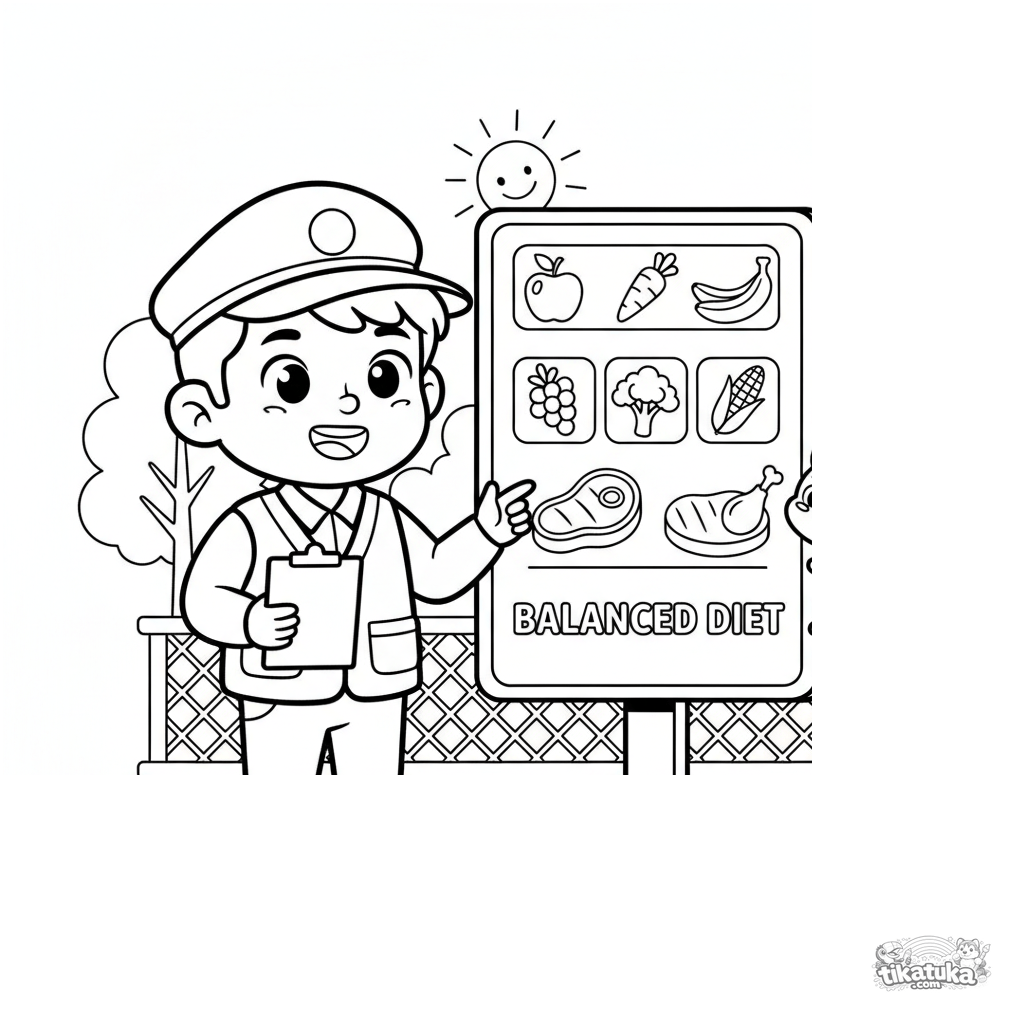 Раскраска для детей 7-9 лет: юный смотритель зоопарка объясняет сбалансированное питание животных у большой информационной таблички. Образовательная сцена для изучения диет.