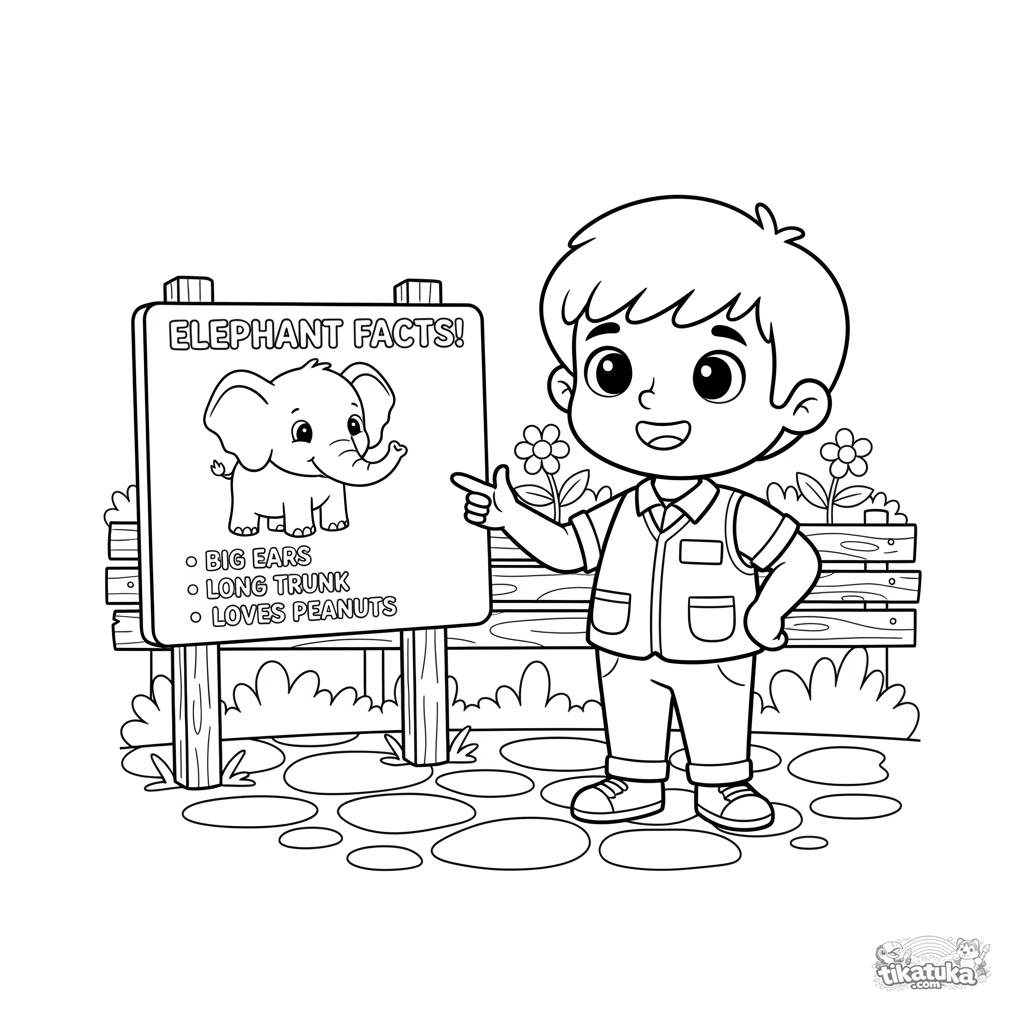 Раскраска для детей 4-6 лет. Весёлый юный смотритель зоопарка объясняет факты о слонах, указывая на большую информационную табличку на дорожке зоопарка.