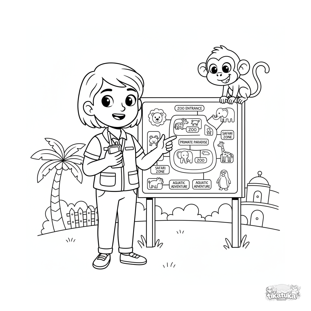 Раскраска для детей 4-6 лет: юный смотритель зоопарка объясняет карту у информационного стенда. Развивает понимание ориентирования и знакомит с профессиями.