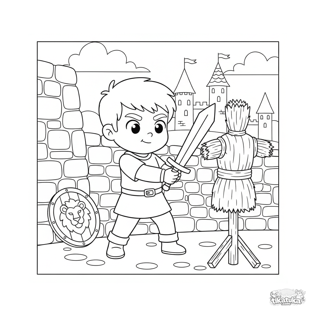 Раскраска для мальчиков 4-6 лет: юный рыцарь тренируется с деревянным мечом на соломенном манекене во дворе замка. Яркая, динамичная сцена с понятными деталями.