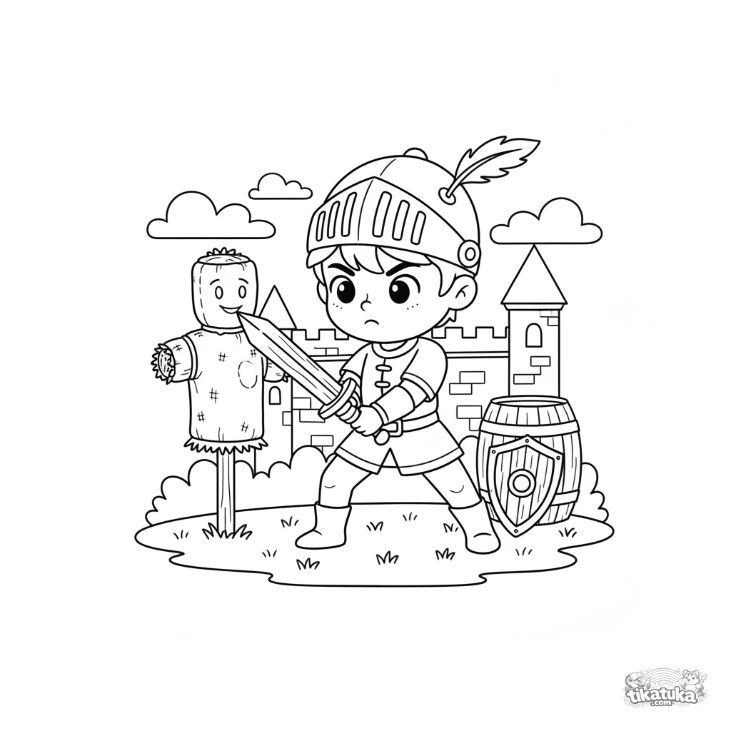 Раскраска для мальчиков 4-6 лет: юный рыцарь тренируется с деревянным мечом на замковом дворе. Простая и увлекательная сцена для раскрашивания.