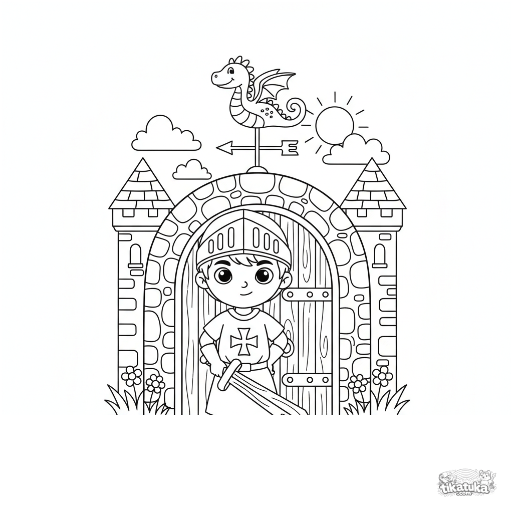Раскраска для мальчиков 4-6 лет: юный рыцарь с деревянным мечом стоит на страже у ворот замка. Яркая, динамичная сцена для раскрашивания.