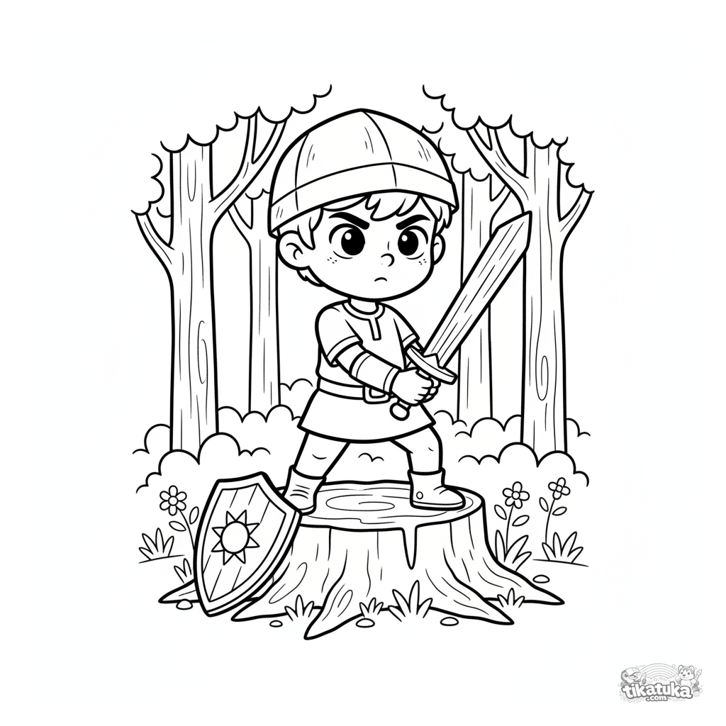 Раскраска для мальчиков 4-6 лет: юный рыцарь тренируется с деревянным мечом на пне в лесу. Динамичная и простая для раскрашивания сцена.