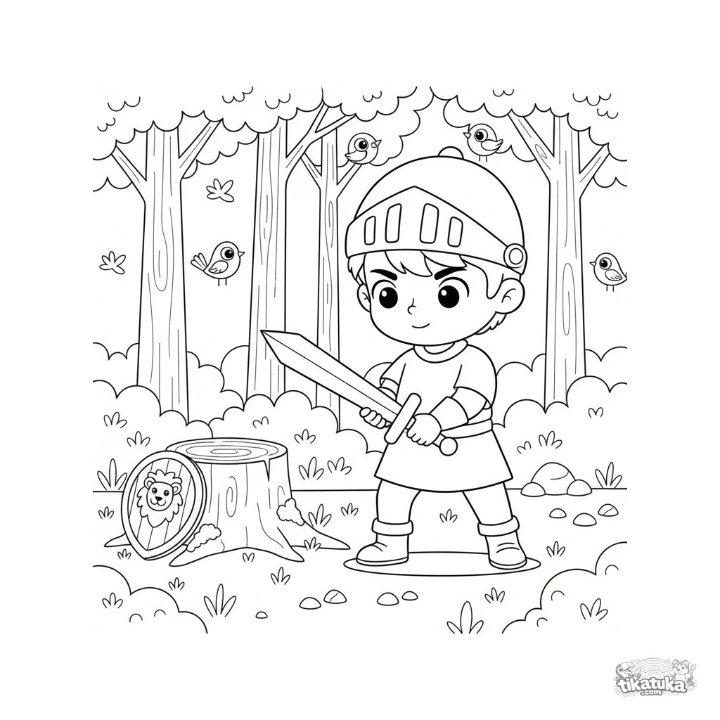 Раскраска для мальчиков 4-6 лет: юный рыцарь тренируется с деревянным мечом на лесной полянке. Динамичная и простая сцена.