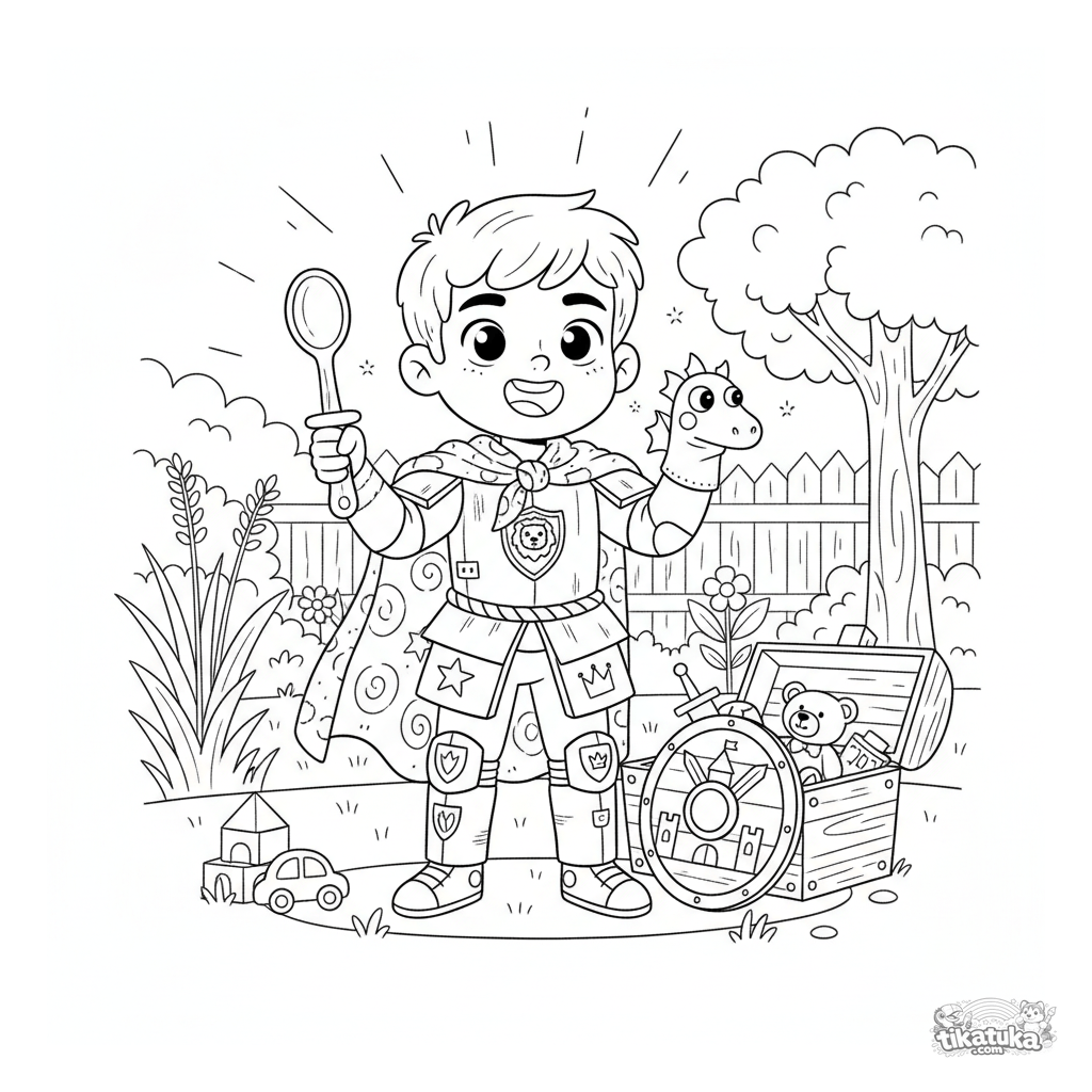 Раскраска для мальчиков: юный рыцарь в картонном доспехе сражается с драконом-носок в саду. Для детей 3-6 лет. В руках деревянный меч-ложка и картонный щит.