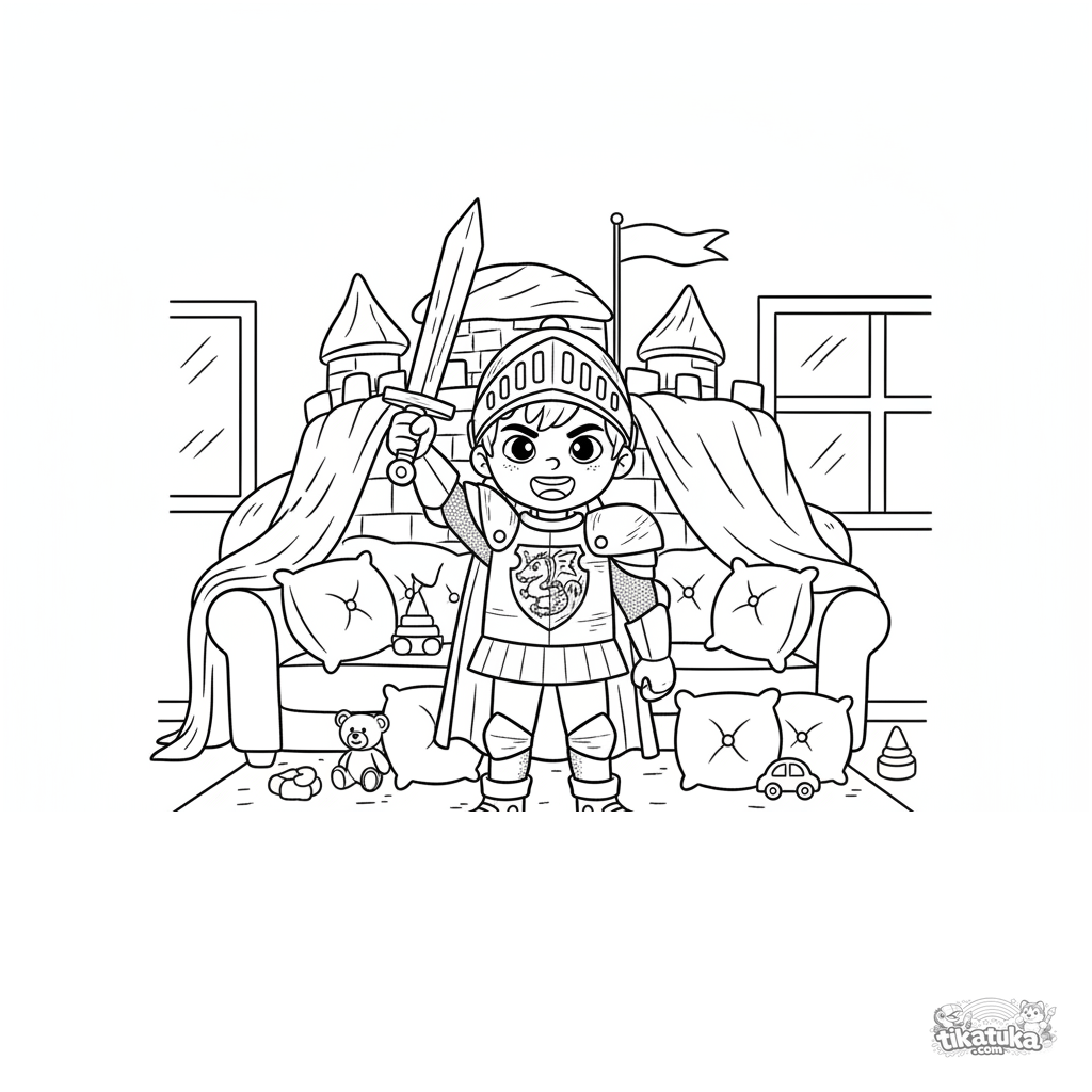 Раскраска с мальчиком-рыцарем в картонных доспехах, защищающим крепость из подушек. Для мальчиков 5-8 лет. Сцена, развивающая воображение и творчество.