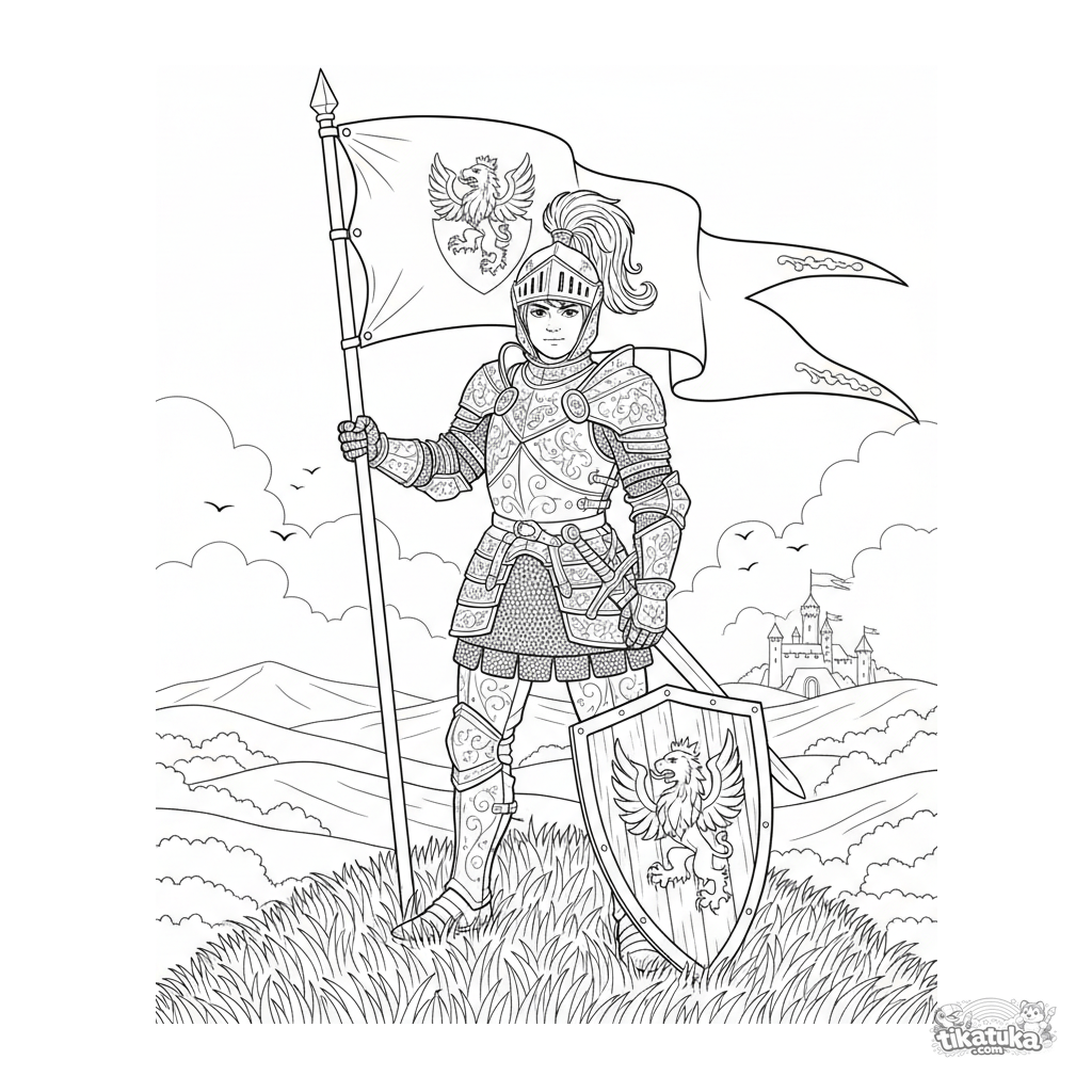 Раскраска для мальчиков 7-12 лет: юный рыцарь в доспехах стоит с флагом на холме. Детализированное реалистичное изображение для увлечённых раскрашиванием.