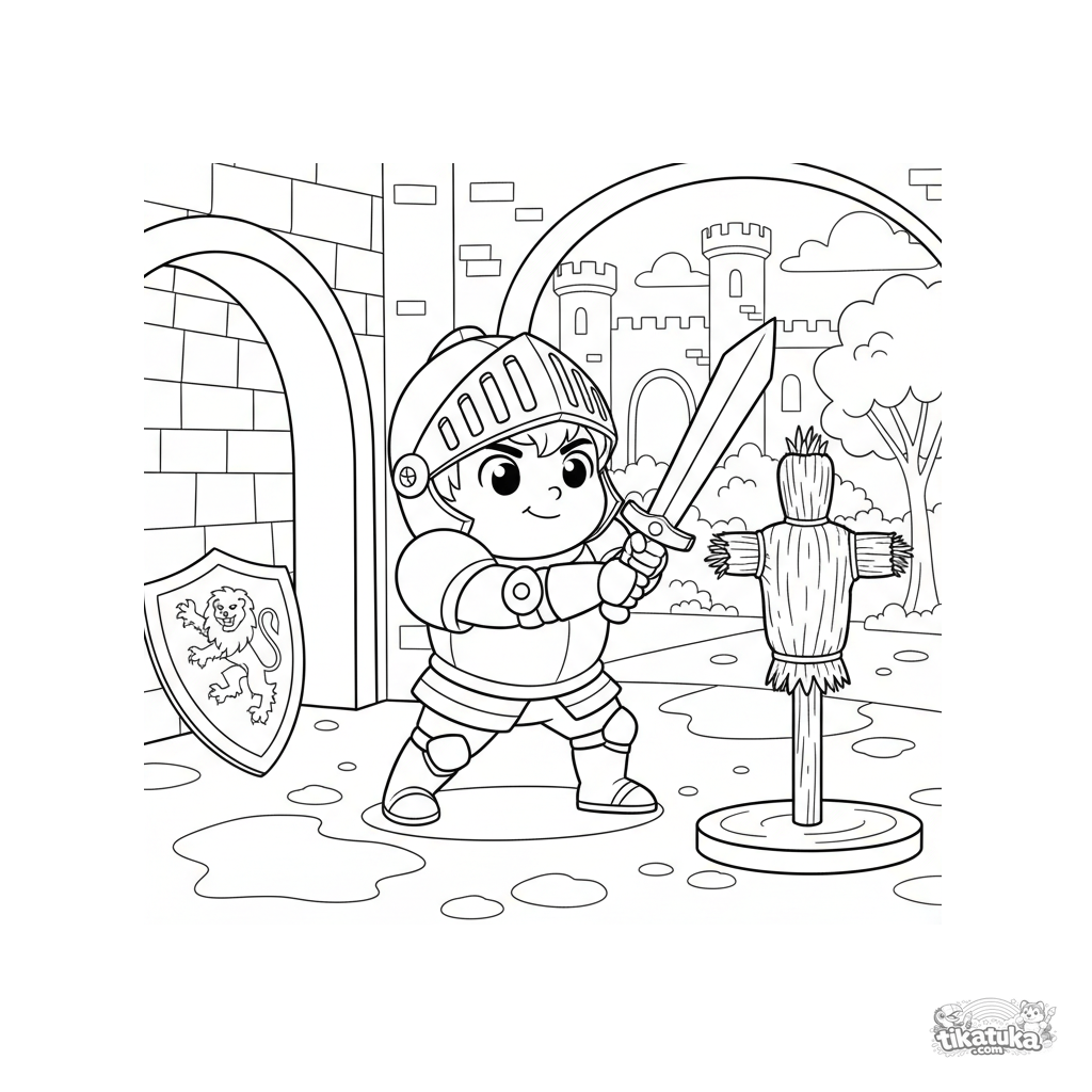 Раскраска для мальчиков: юный рыцарь тренируется с мечом на соломенном манекене во дворе замка. Для детей 4-6 лет, развивает концентрацию.