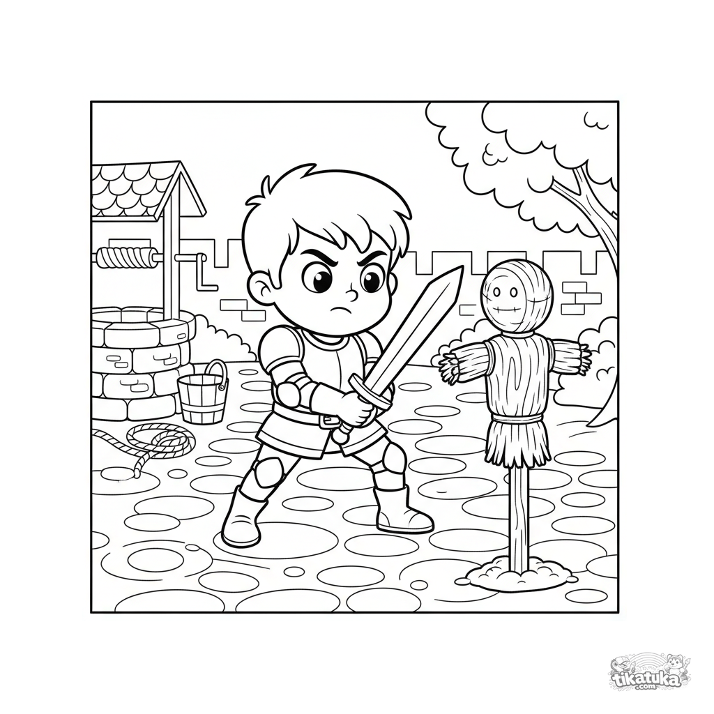 Раскраска для мальчиков: юный рыцарь тренируется с деревянным мечом на соломенном манекене во дворе замка. Для детей 5-8 лет.