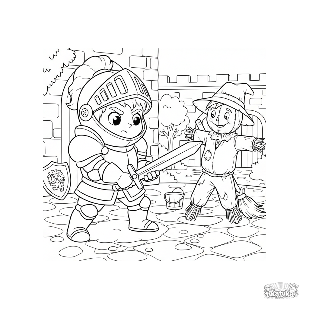 Раскраска для мальчиков 4-6 лет: юный рыцарь в доспехах тренируется фехтовать на деревянном мече со страшилой во дворе замка.