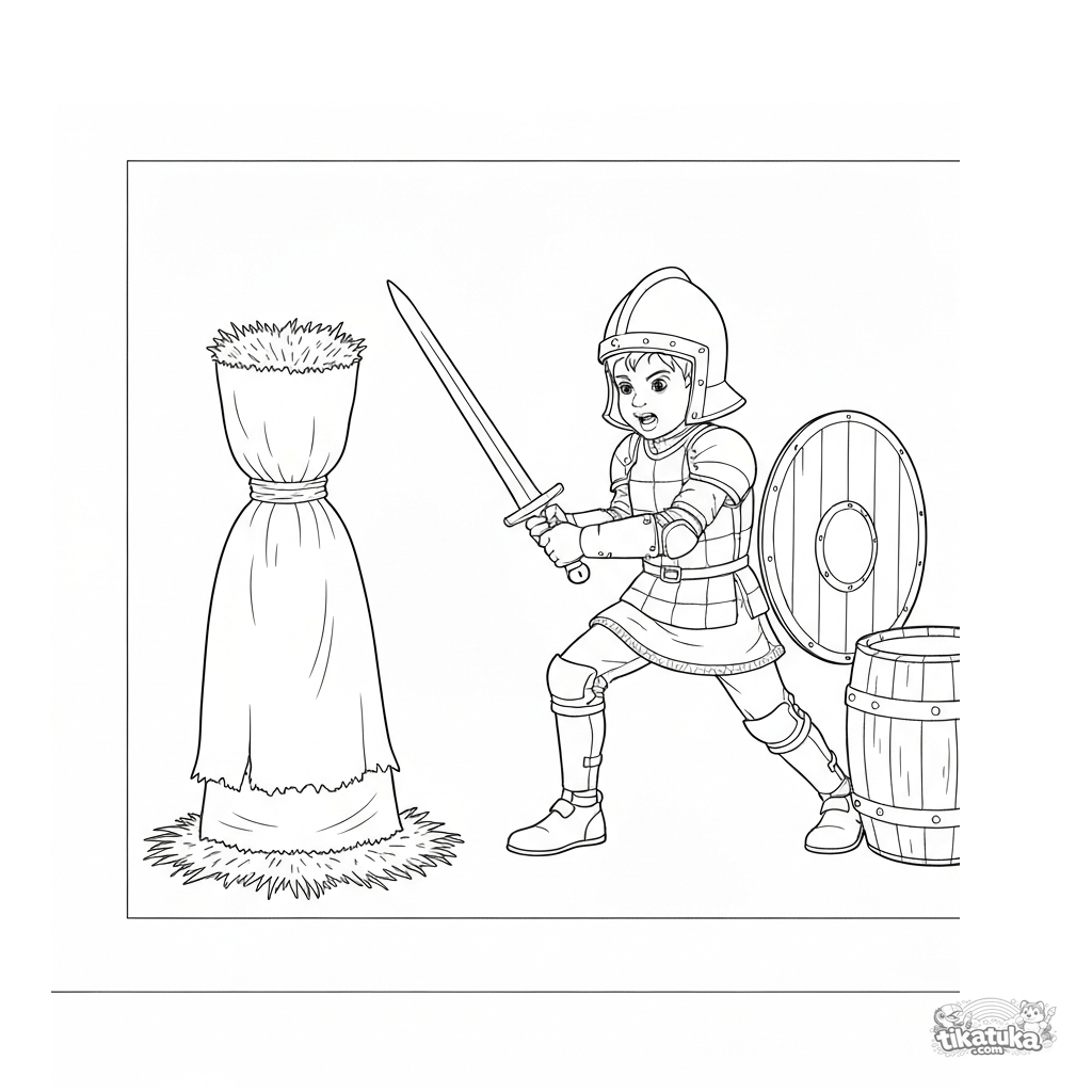 Раскраска с юным рыцарем, который тренируется с деревянным мечом на манекене. Для детей 5-8 лет. Реалистичный стиль с хорошей детализацией.