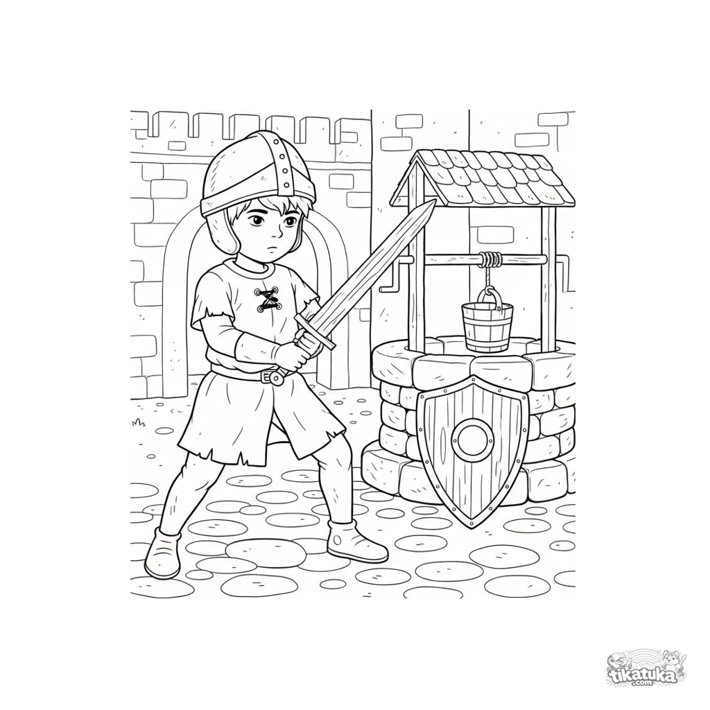 Раскраска для мальчиков 5-7 лет: юный рыцарь тренируется с деревянным мечом во дворе замка. Реалистичный стиль, понятные формы.