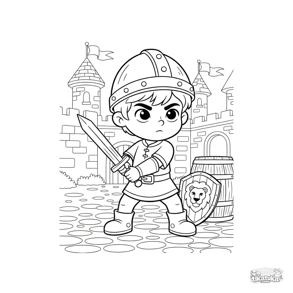 Раскраска для мальчиков: юный рыцарь тренируется с деревянным мечом во дворе замка. Для детей 5-7 лет. Сцена про храбрость и воображение.