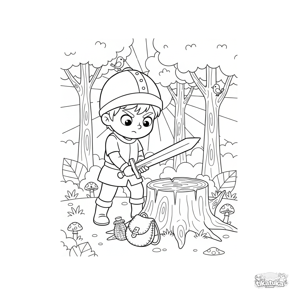 Раскраска для мальчиков 4-6 лет: юный рыцарь в лесу сосредоточенно тренируется с деревянным мечом у пня. Динамичная и простая для раскрашивания сцена.
