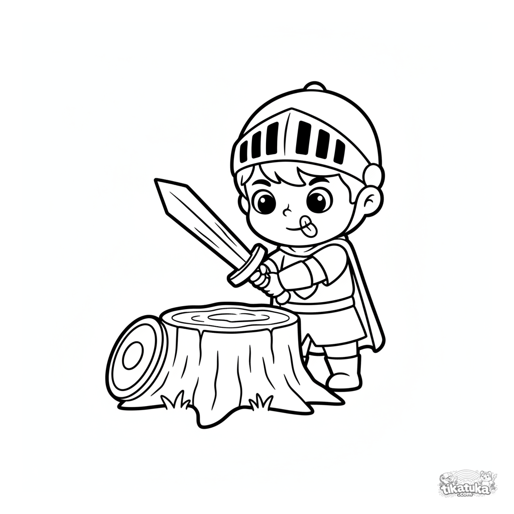 Раскраска с юным рыцарем, который тренируется с деревянным мечом у пня. Для малышей 3-5 лет. Простые крупные формы, идеально для первых раскрасок.