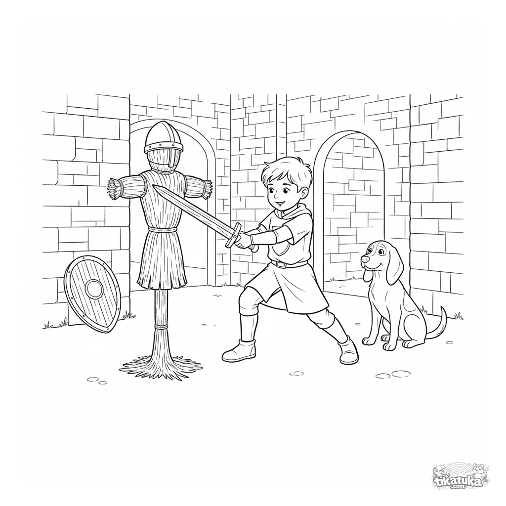 Раскраска для детей 5-8 лет: юный рыцарь в плаще с гербом тренируется с деревянным мечом на соломенном манекене в замковом дворе, за ним наблюдает верный пёс.