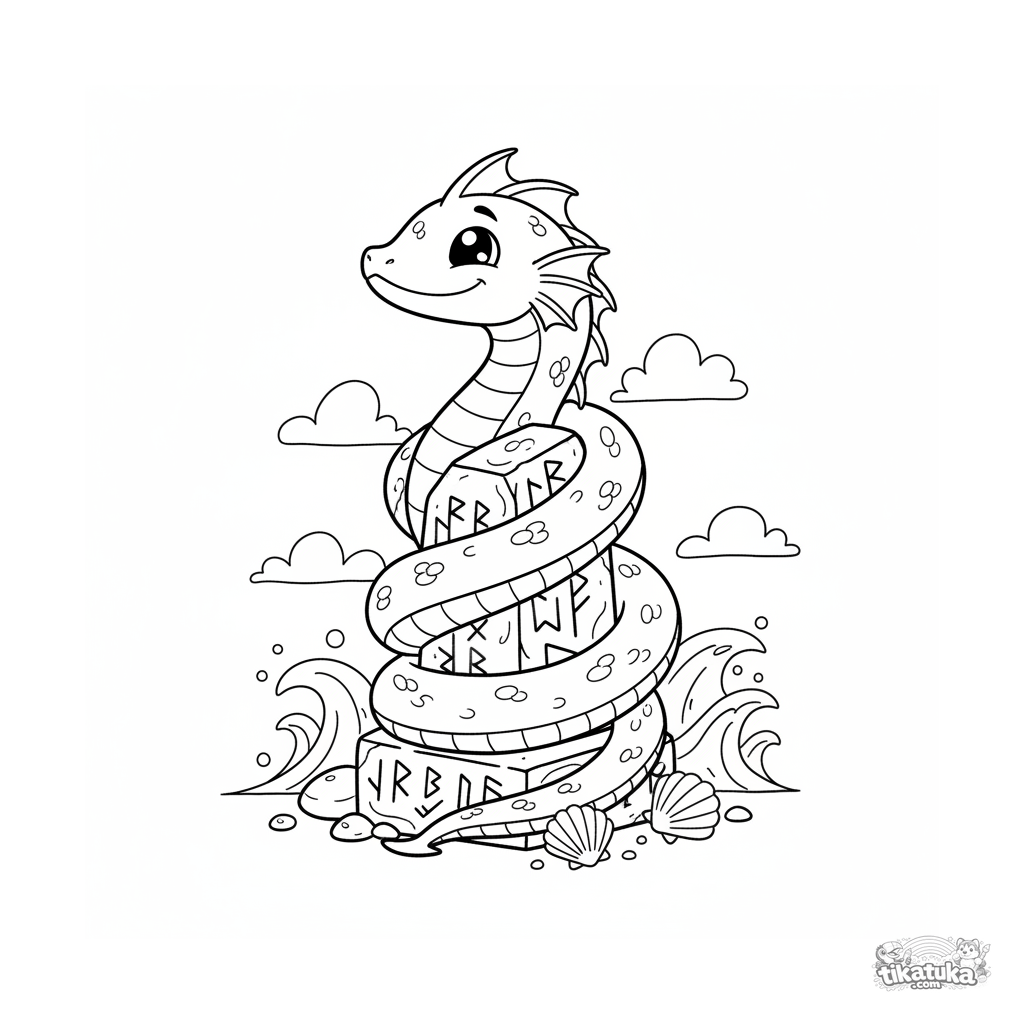 Раскраска для детей 7-9 лет: дружелюбный морской змей обвивает древний светящийся монолит с рунами. Динамичная поза, детали фона.