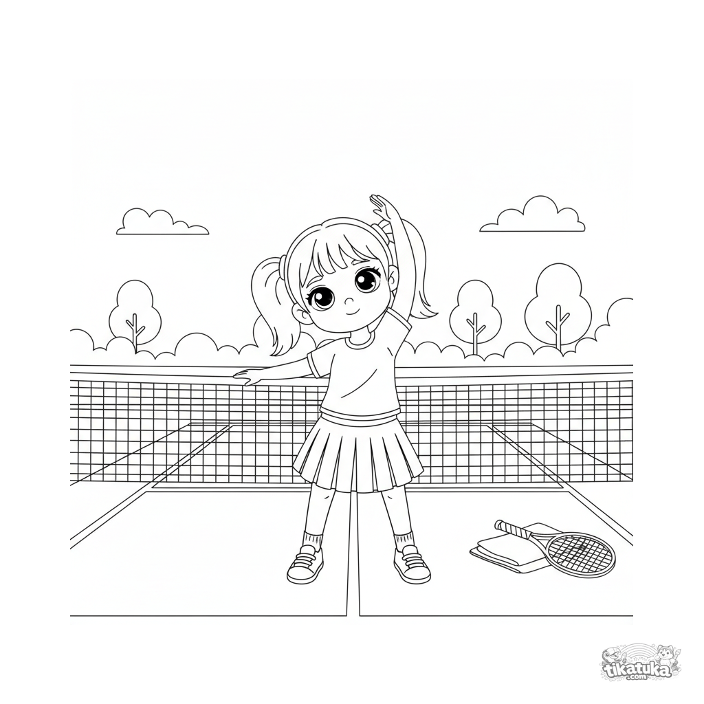 Раскраска для детей 4-6 лет: юная теннисистка делает растяжку у сетки на корте. Умеренная детализация, понятные формы.