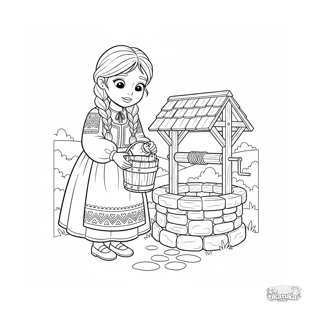 Раскраска для детей 4-6 лет: девочка в народном платье набирает воду из волшебного колодца. Простые формы и милая сцена из деревенской жизни.