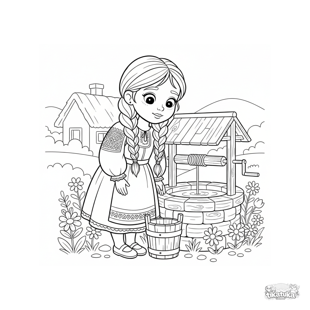 Раскраска для детей 4-6 лет: девочка в народном платье у деревянного колодца с живой водой. Простые формы, понятный сюжет, развивает мелкую моторику.