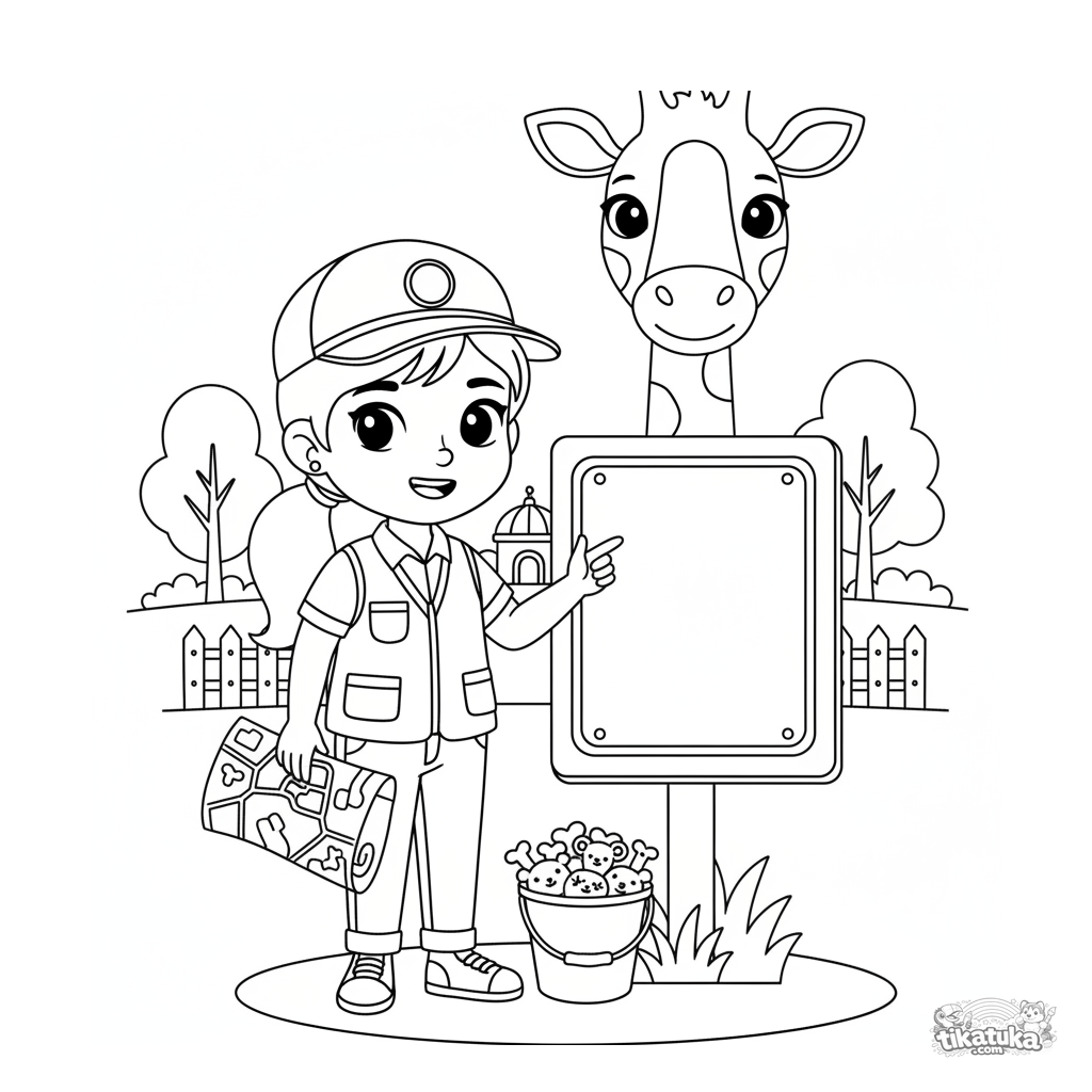 Раскраска для детей 4-6 лет: юный смотритель зоопарка у информационной таблички в форме жирафа. Образовательная сцена о профессиях.