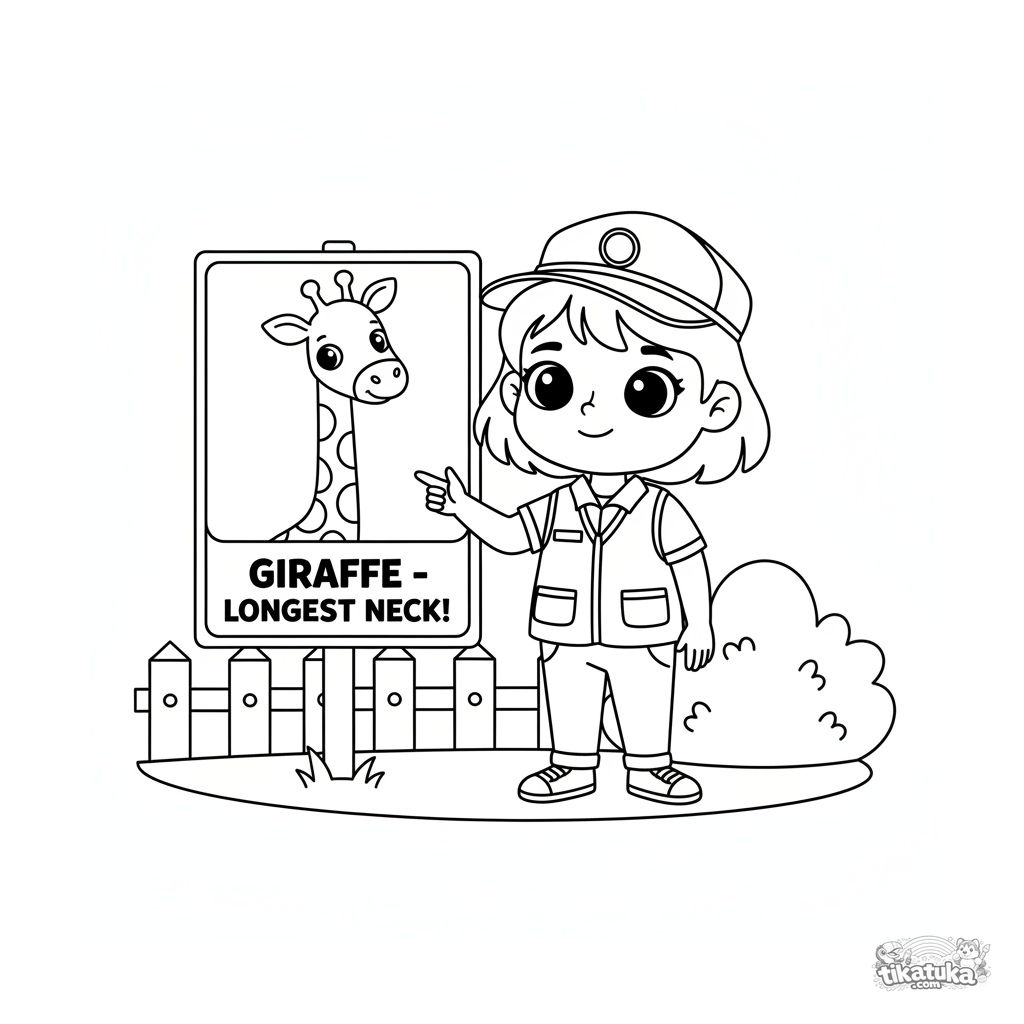 Раскраска для детей 4-6 лет: юный смотритель зоопарка объясняет факты о жирафе у большой информационной таблички. Простая сцена для обучения и творчества.