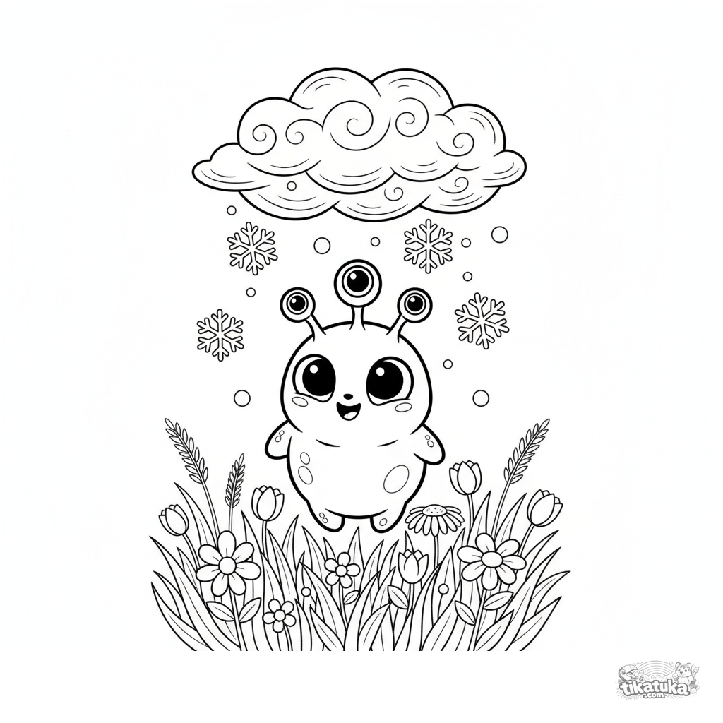 Инопланетянин Зип удивляется первому снегу над летним лугом. Скачайте, распечатайте или раскрасьте онлайн!