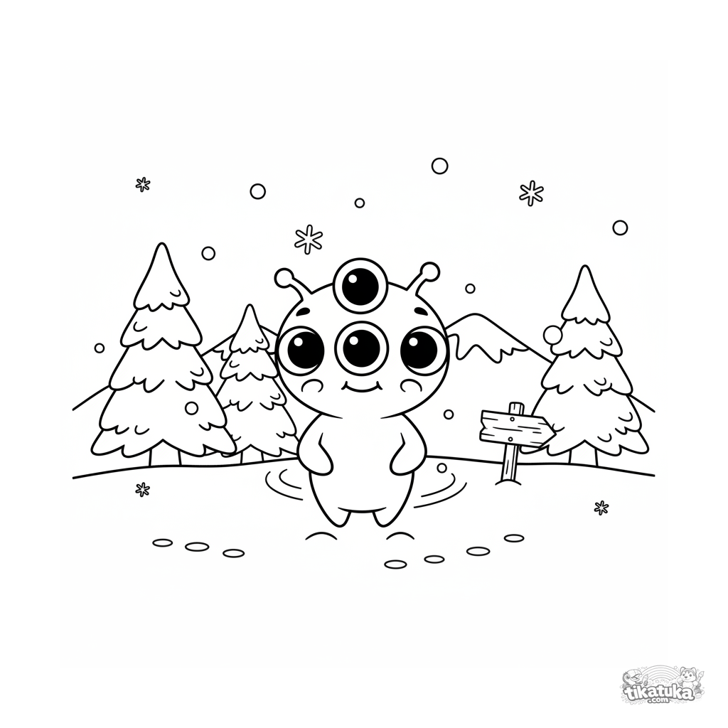 Инопланетянин Зип растерянно стоит на заснеженном лугу под падающим снегом. Скачайте, распечатайте или раскрасьте онлайн этот фантастический мир.