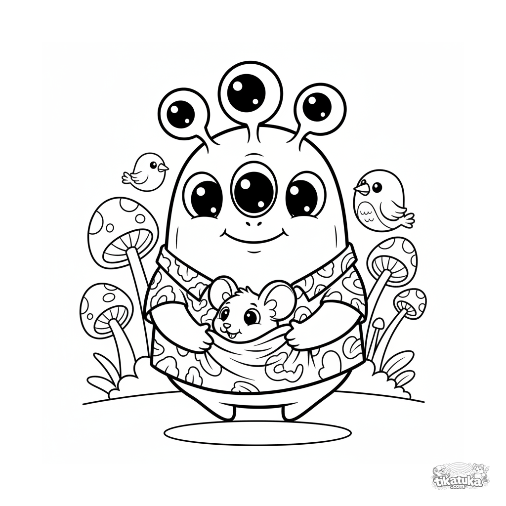 Добрая раскраска: инопланетянин Зип согревает мышонка своей рубашкой. Скачайте, распечатайте или раскрасьте онлайн эту трогательную сцену дружбы.