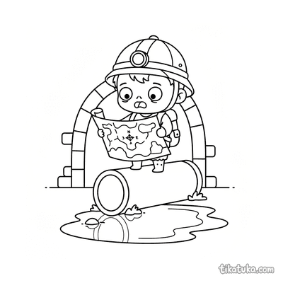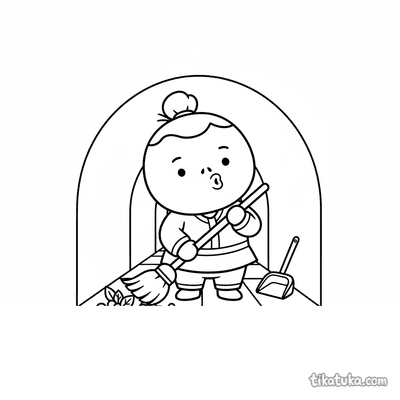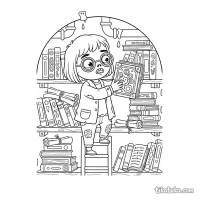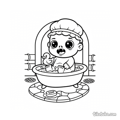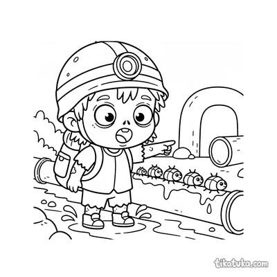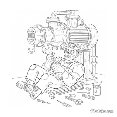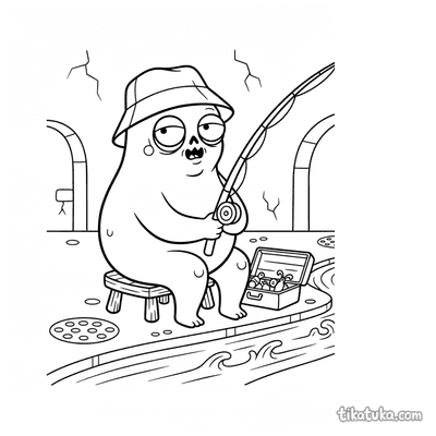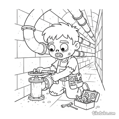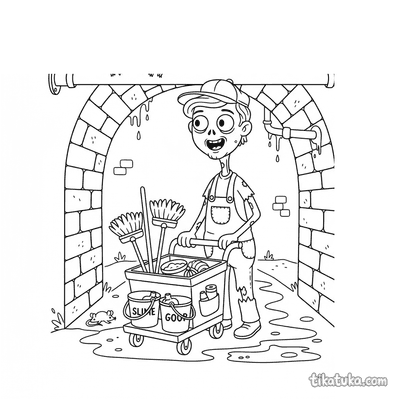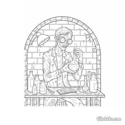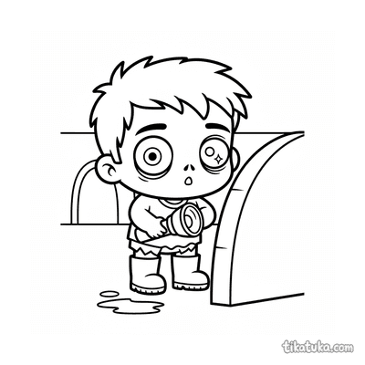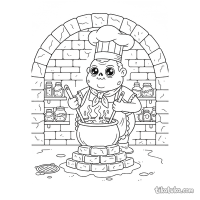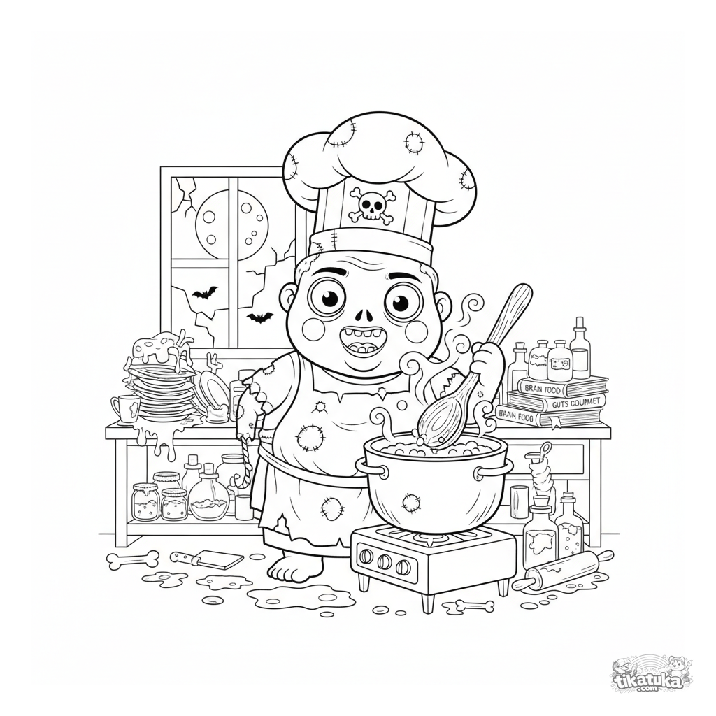 Забавная раскраска для мальчиков 4-6 лет: дружелюбный зомби в колпаке повара помешивает большой котёл. Милая, не страшная сцена с юмором.