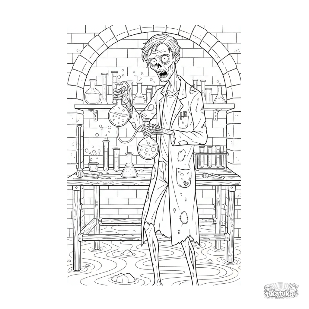 Сложная раскраска для детей 10-12 лет: зомби-химик проводит эксперимент в импровизированной лаборатории внутри канализационного коллектора. Много деталей и научных приборов.