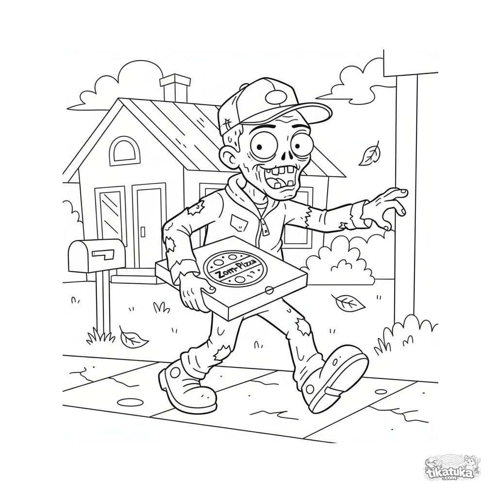 Забавная раскраска для мальчиков 4-6 лет: дружелюбный зомби-курьер несет пиццу. Веселая и нестрашная сцена в мультяшном стиле.