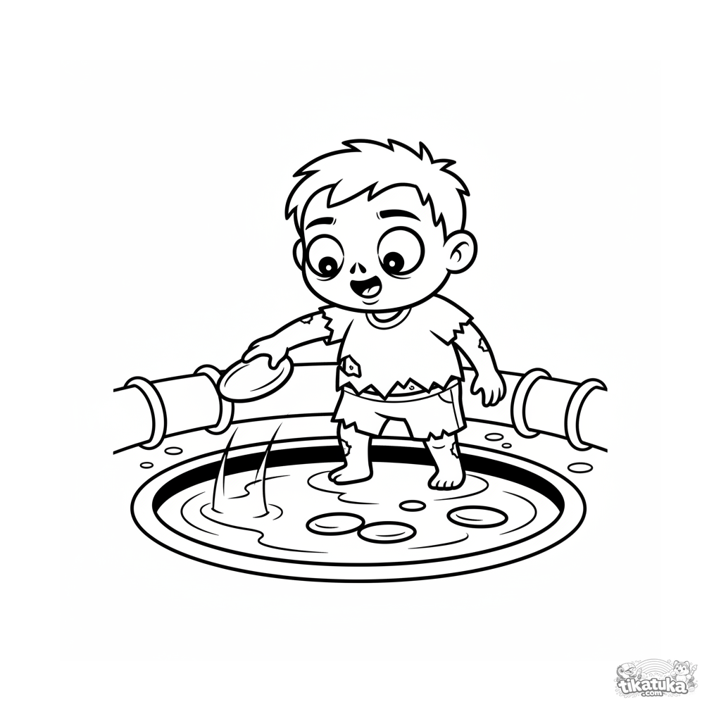 Раскраска для детей 4-6 лет: зомби-малыш стоит у огромного резервуара в канализации и готовится пустить камешек по воде. Простая и понятная сцена.