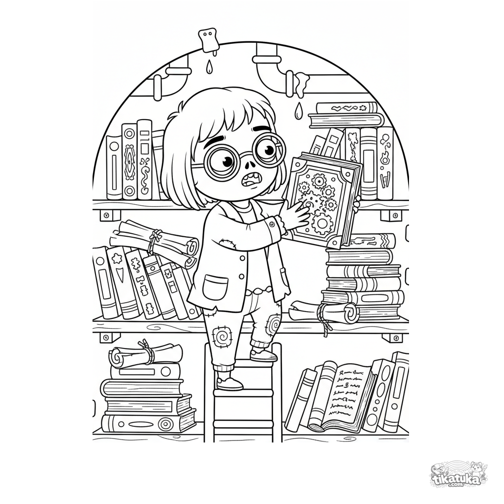 Детальная раскраска для детей 10-12 лет: зомби-библиотекарь упорядочивает книги в подземном архиве, устроенном в канализационном коллекторе. Много элементов, стиль книжной иллюстрации.