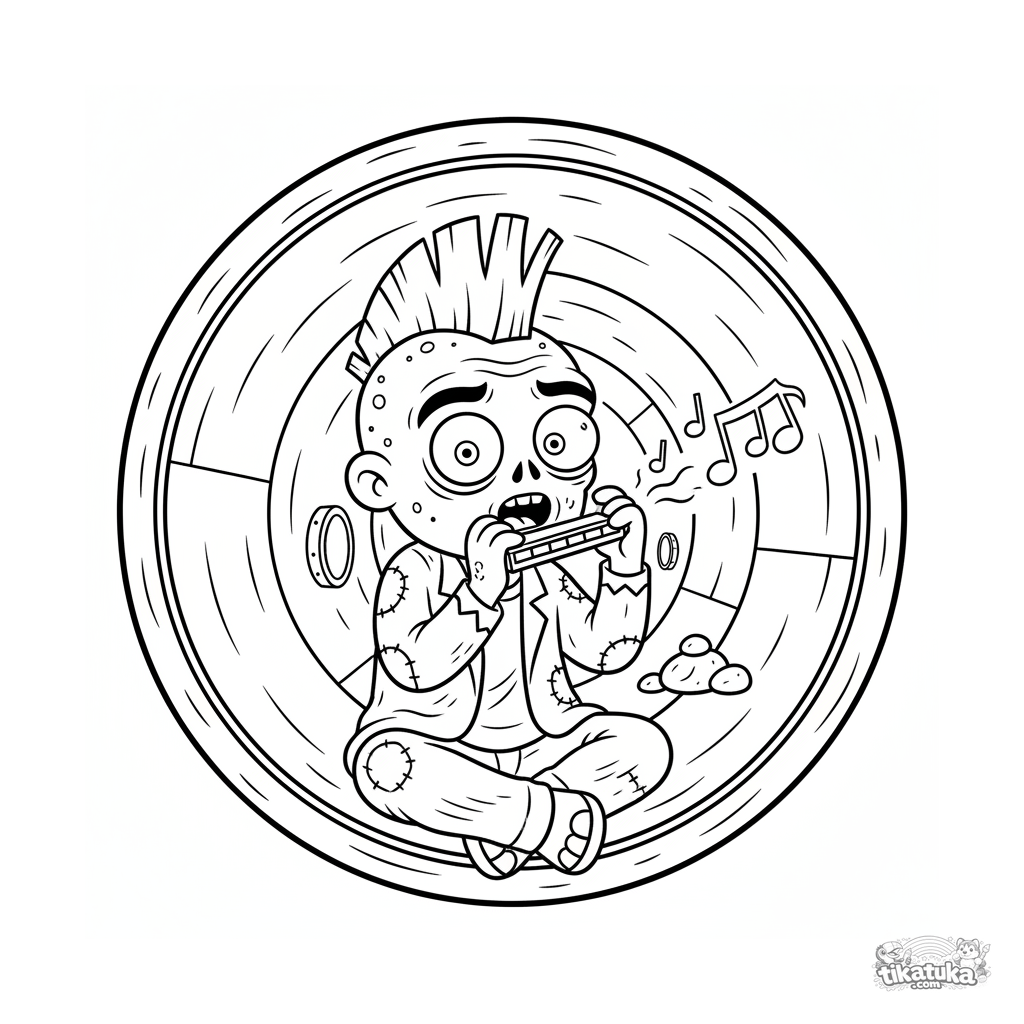Раскраска для детей 7-9 лет: весёлый зомби с ирокезом играет на губной гармошке, сидя внутри большой канализационной трубы. Динамичная сцена с нотами.