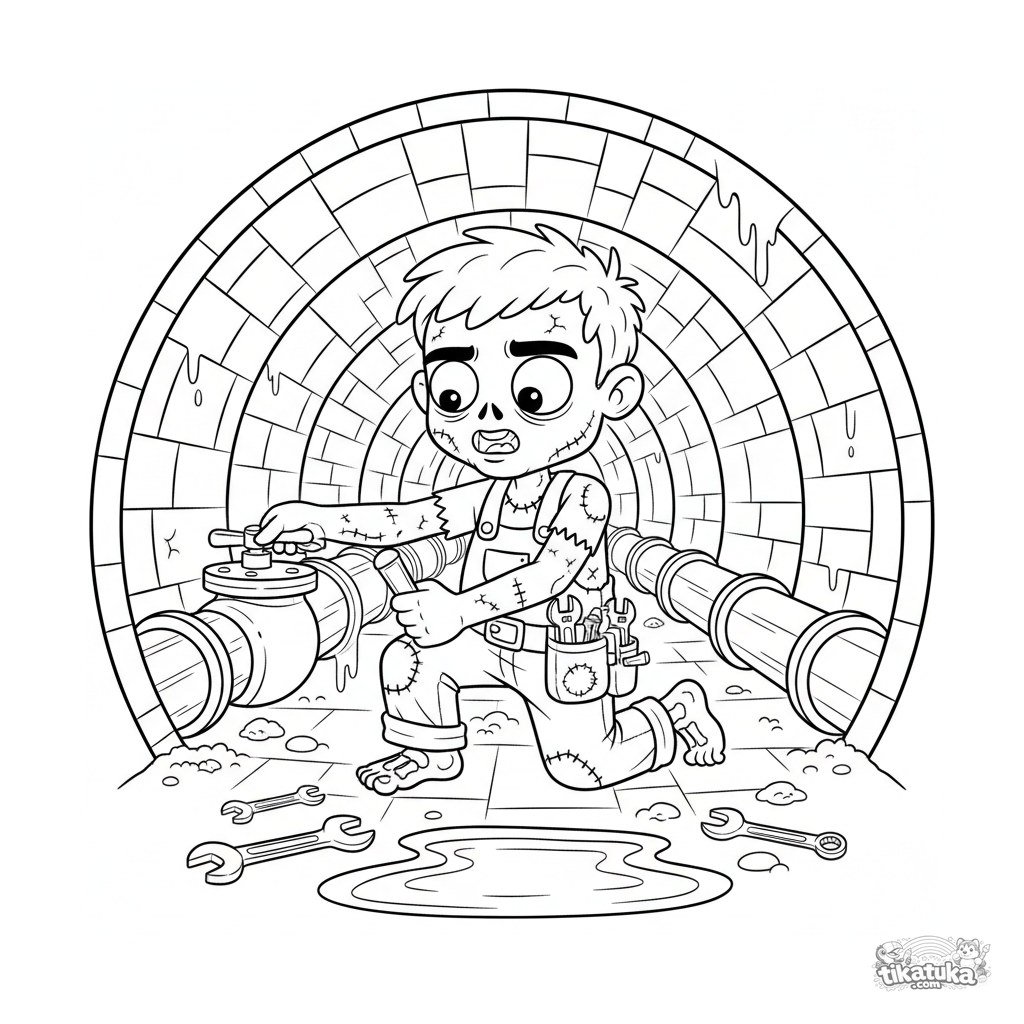 Раскраска для детей 7-9 лет: дружелюбный зомби-водопроводчик за работой в канализационном коллекторе. Подходит для мальчиков, развивает воображение.